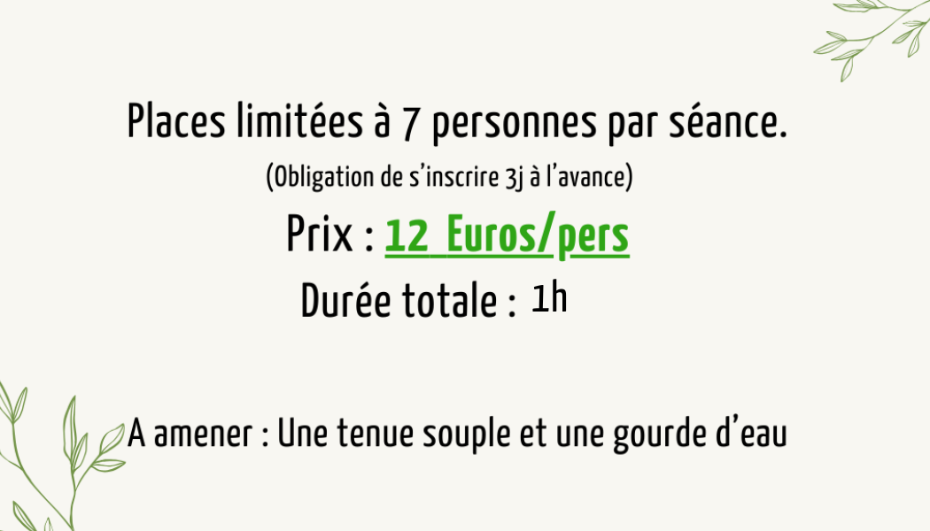 respiratoire, une posture idéale, une détente du corps et de l’esprit et bien d’autres bénéfices encore.Le 2 premières séances d’une durée de 1 H 30 chacune seront pour faire tous les tests sur
